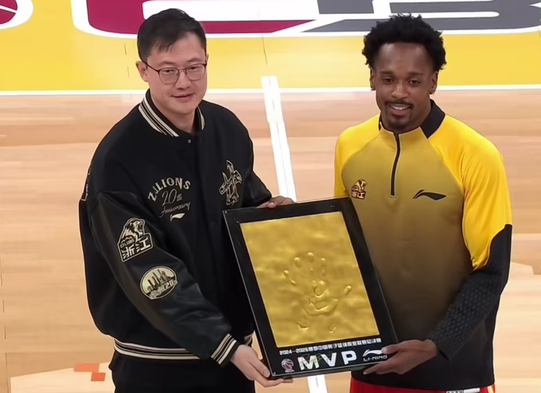 广厦外助布朗领取上赛季的总决赛MVP手模。